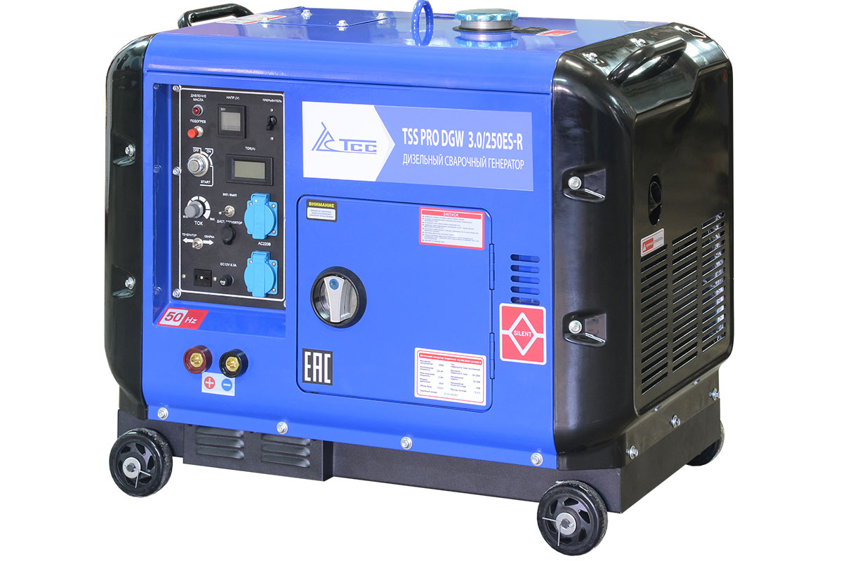 Сварочный дизельный генератор TSS PRO DGW 3.0/250ES-R в супертихом кожухе предназначен для проведения высококачественной Ручной Дуговой Сварки. Имеет дополнител…