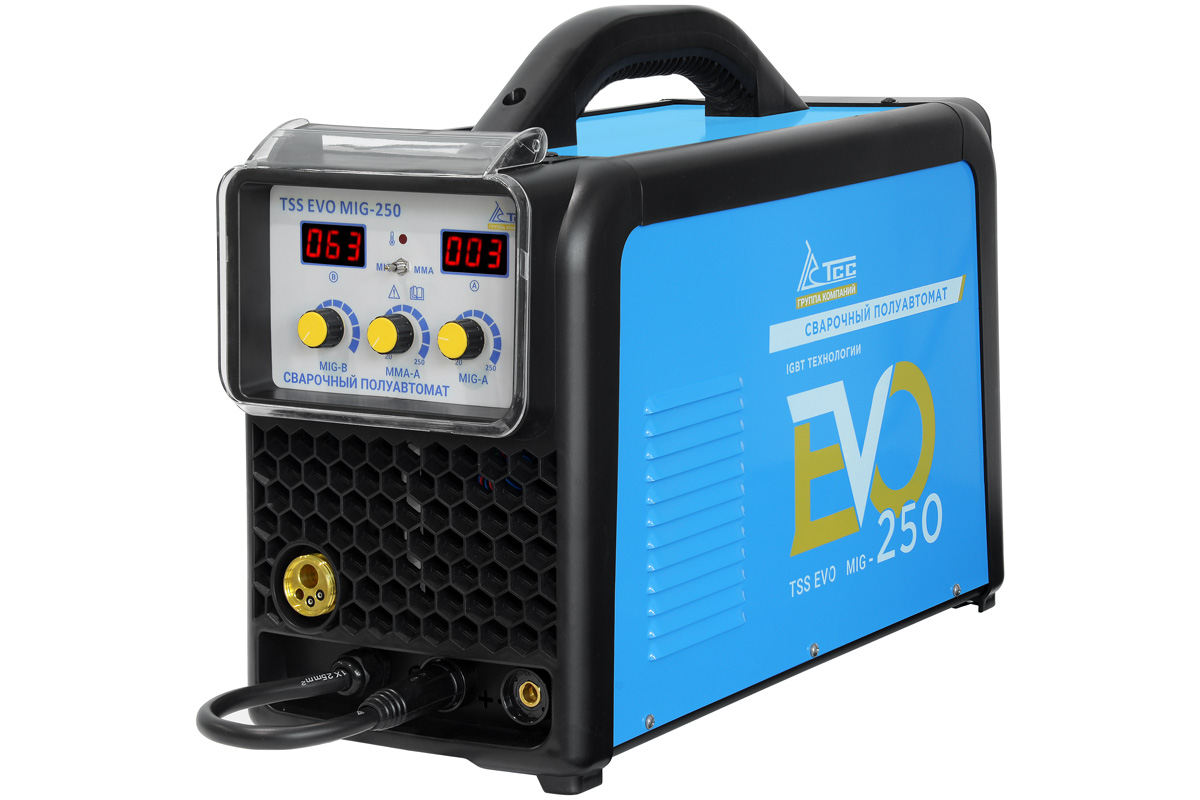 TSS EVO MIG-250 — Сварочный полуавтомат инверторный. Компактный, легкий, удобный для переноски, а также при транспортировке, хранении. Корпус из листовой стали, надежно з…